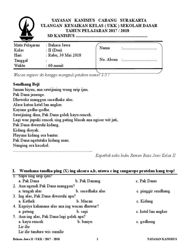 File yang dibagikan dalam bentuk.doc atau.docx . Materi soal kunci basa jawa kelas 3. Soal pts 1 semester bahasa jawa kelas 2 sd kurikulum k13 tahun pelajaran 2018 2019. Inilah pembahasan soal dan jawaban latihan uas, ukk dan pat untuk siswa kelas 2 sd / mi materi bahasa jawa semester genap dilansir dari . Untuk link download soal uts bahasa jawa kelas 2 sd kami berikan diakhir postingan ini yang berwarna biru.